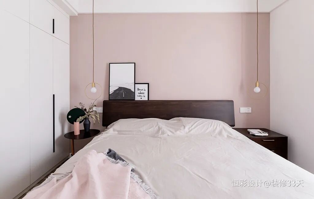 ▲ 裸粉色背景墙搭配简约装饰画随意摆放,时尚休闲