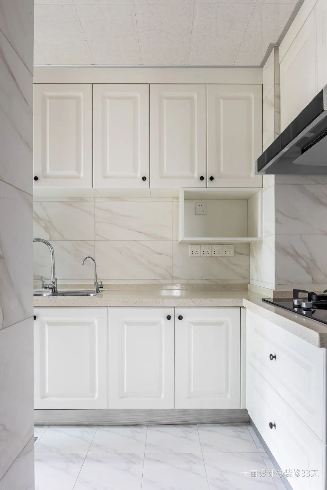 ▲ 厨房以白色为主,整体干净明亮,吊柜下方设计开放格,留给小家电