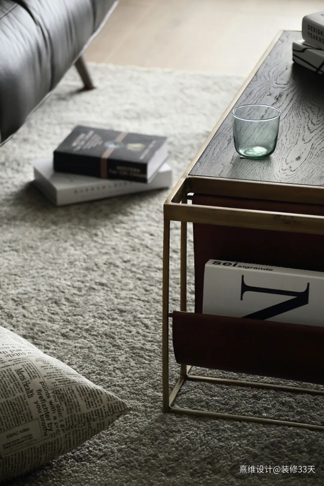 ▲ 客厅以淡雅色系为基调,米灰色墙布搭配相近色系窗帘,皮质沙发、毛绒地毯、黄铜茶几兼杂志架,搭配屋主从国外淘回来的音箱,复古且时髦