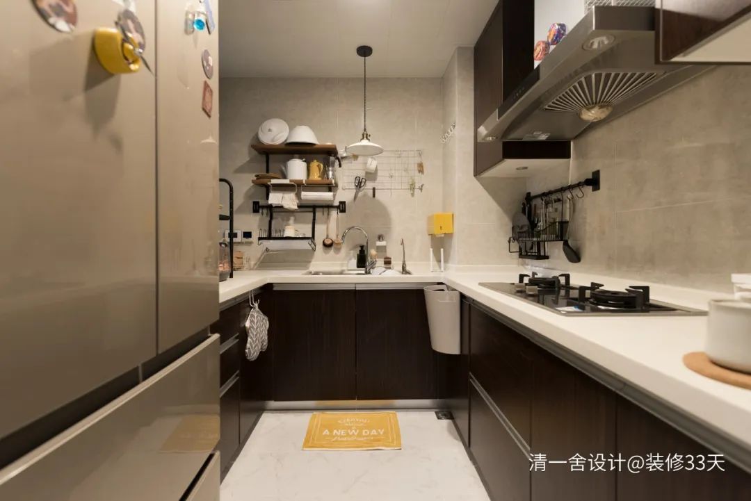 ▲ 厨房空间改动不大,设计置物架与吊灯,保持台面干净整洁,同时增加了仪式感