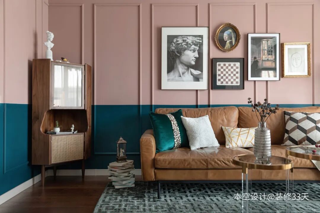 ▲ 角落的斗柜颜值高,上下柜、中部镂空的设计也方便储物,深棕色令它复古气息十分浓郁,刚好呼应墙面的艺术装饰画
