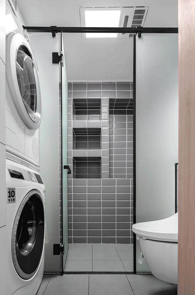 ▲ 卫生间干湿分区,与主卧之间采用S墙设计,满足了洗衣机+烘干机的摆放,淋浴区背景设计壁龛,美观又实用