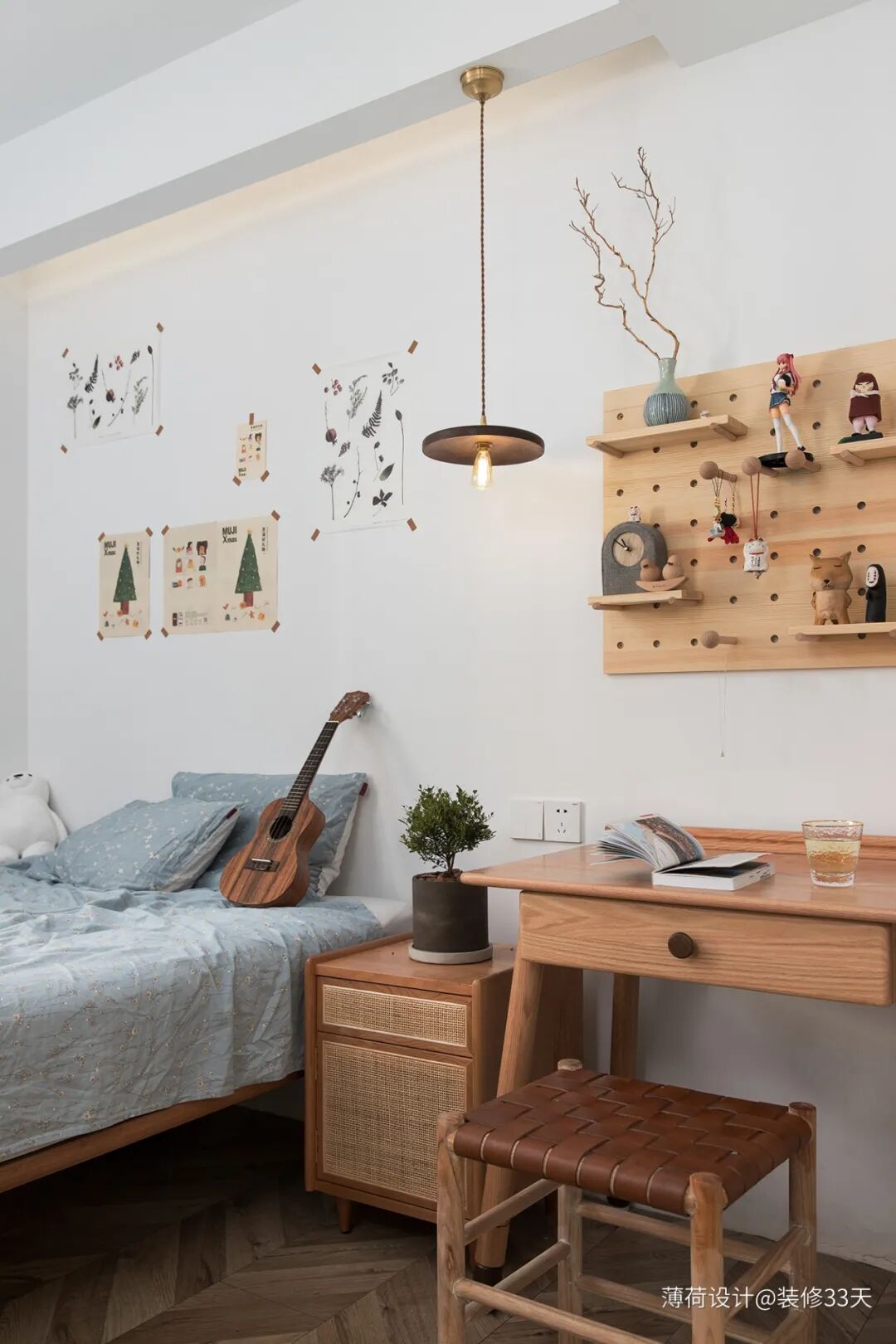 ▲ 设置了一个小巧的阅读区,立面设计洞洞板,既是装饰又可置物
