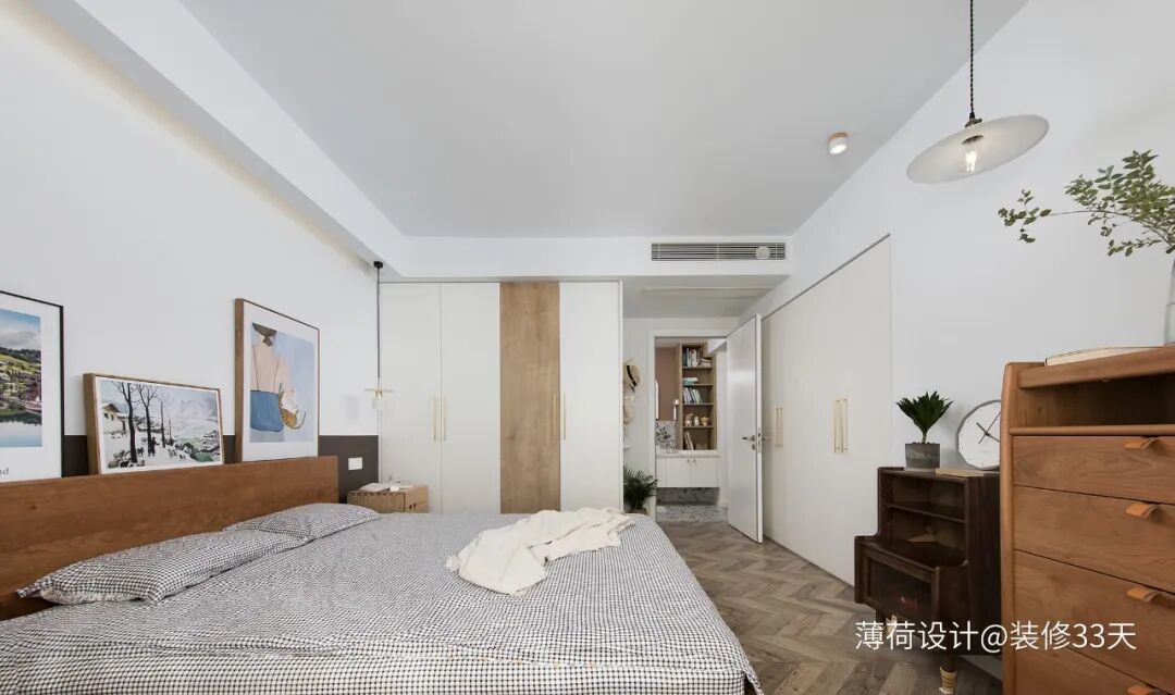 ▲ 主卧以白色与木色为主,搭配出自然舒适的氛围,两面嵌入式柜体大大增加了收纳空间