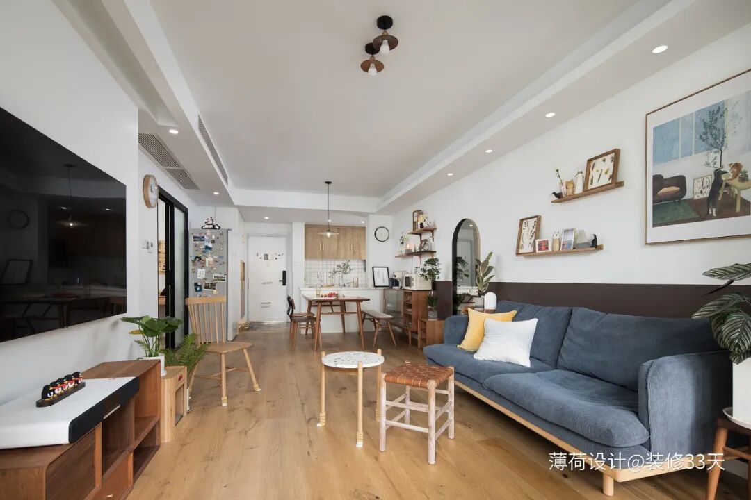 ▲ 客餐厅一体化的格局,让整个空间通透明亮,原木地板满是温暖的感觉,中间的拱形全身镜,让空间有了延伸感