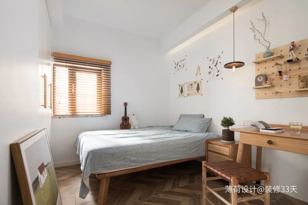 ▲ 次卧本身的采光条件欠佳,房门采用长虹玻璃(上张图可见)把客厅的自然光引进室内,百叶窗的设计也让采光更加充分
