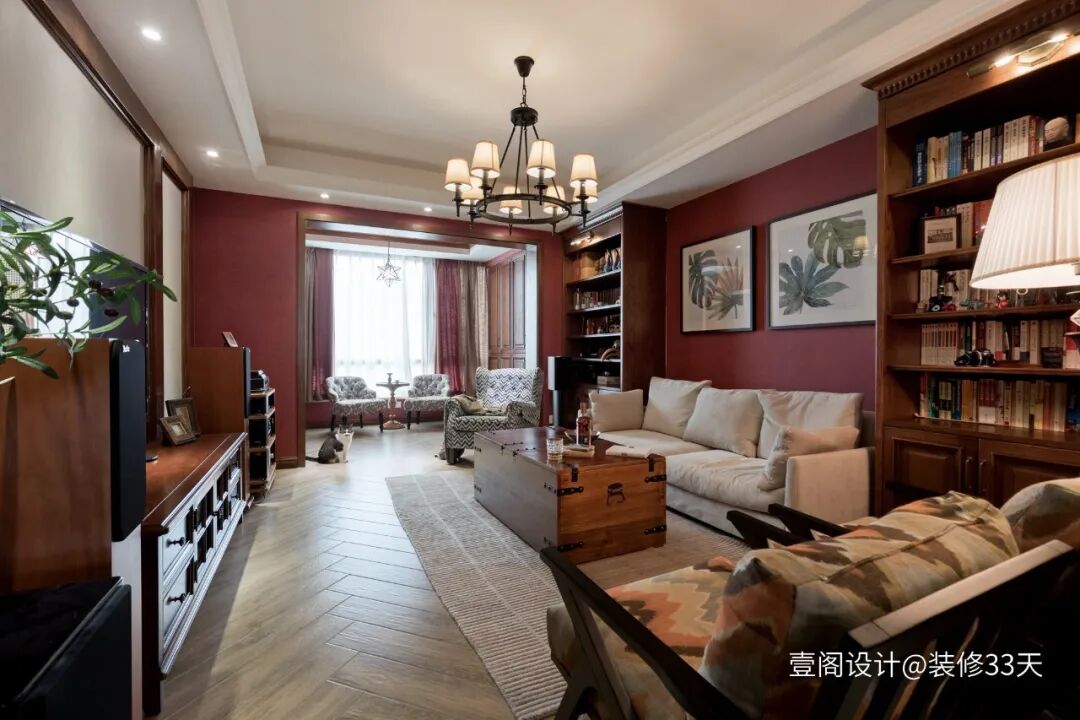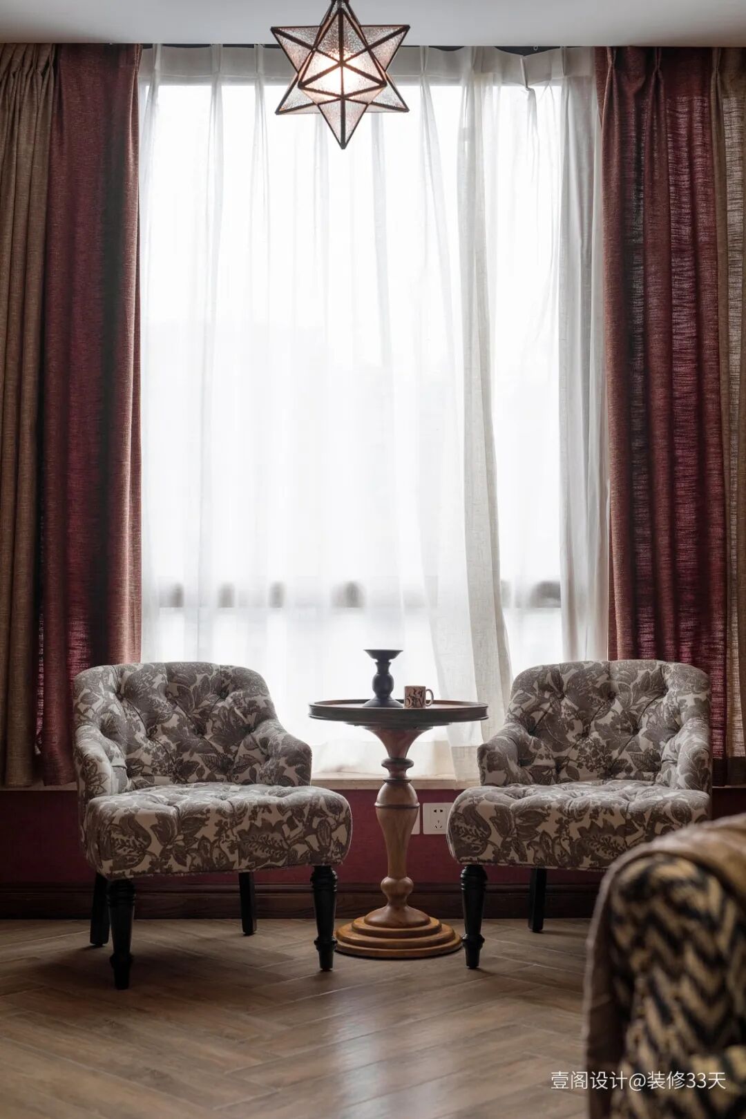 ▲ 客厅纳入阳台布置休闲区,地面人字拼木纹砖,现代线条的顶面安装美式吊灯,酒红色为空间的主要基调