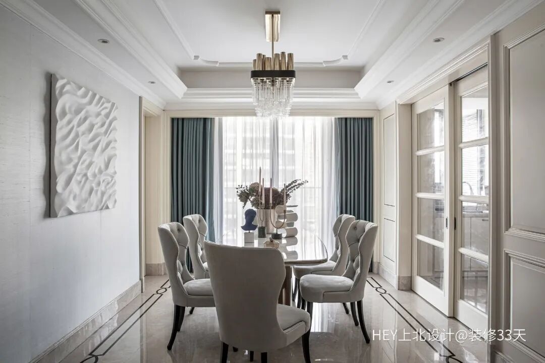 ▲ 米灰色+白色的餐厅家具,搭配同色系的背景墙面,装饰画的视觉质感与石质餐桌呼应,顶面玻璃与金色质感的吊灯增添层次与轻奢风格