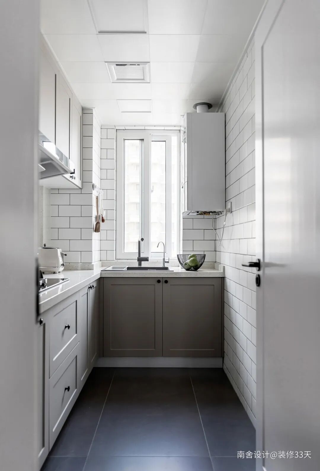 ▲ 厨房,深灰色的防滑地砖搭配工字铺白色地铁砖,浅浅的灰褐色橱柜门,耐看耐脏也显高级