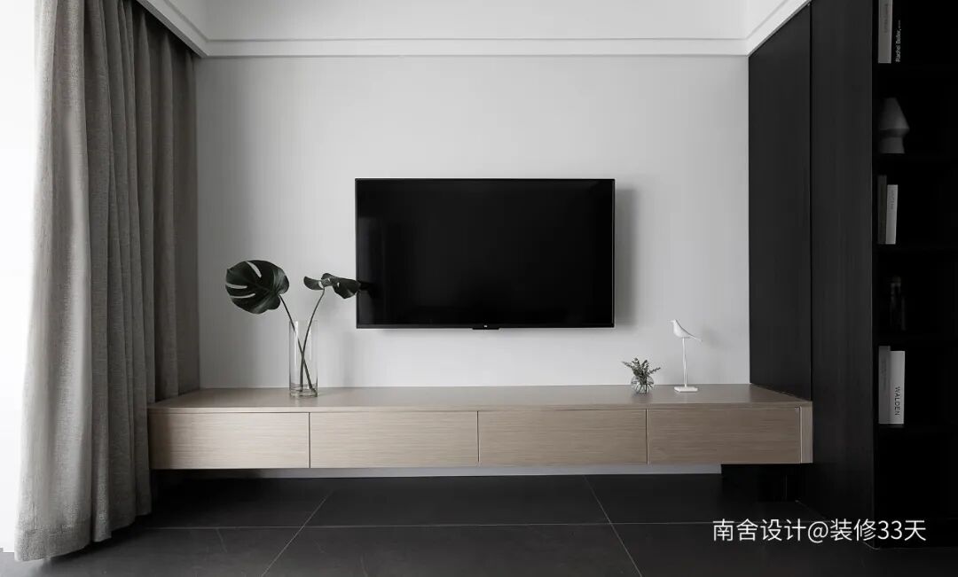 ▲ 电视背景墙采用留白手法,木色悬空电视柜,与一侧的黑色竖柜形成对比