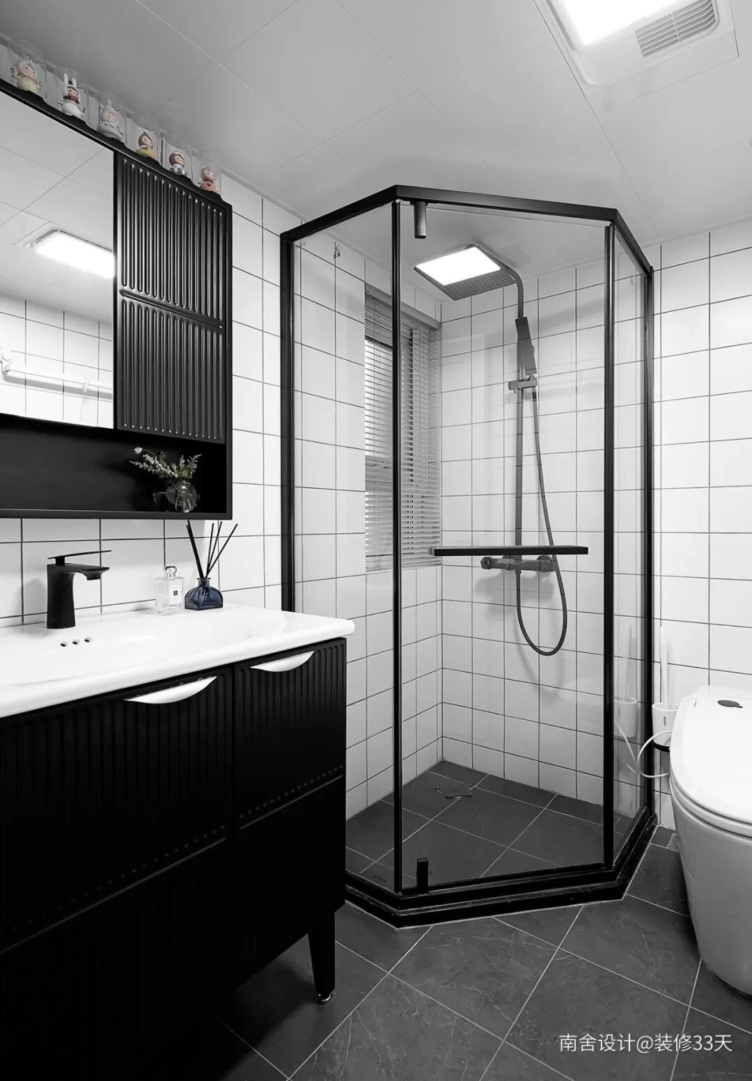 ▲ 卫生间的硬装与厨房硬装呼应,延续灰地砖配白色墙砖,黑色的家具与五金加深空间层次感