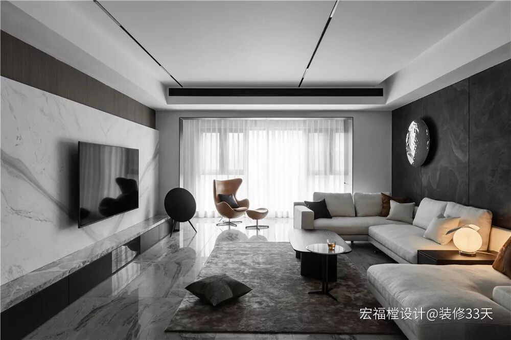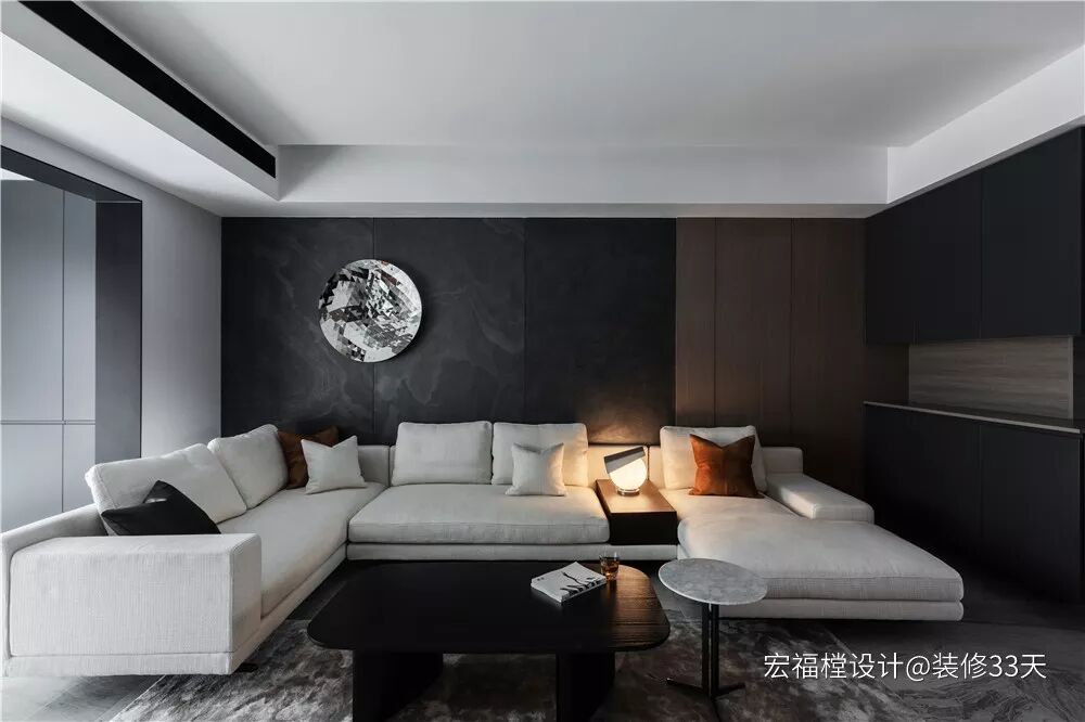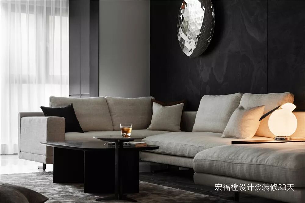 ▲ 整体以黑白灰为主,辅以木饰面修饰,墙面的璀璨装饰挂件呼应空间配色,沙发上的球形台灯营造出温馨氛围