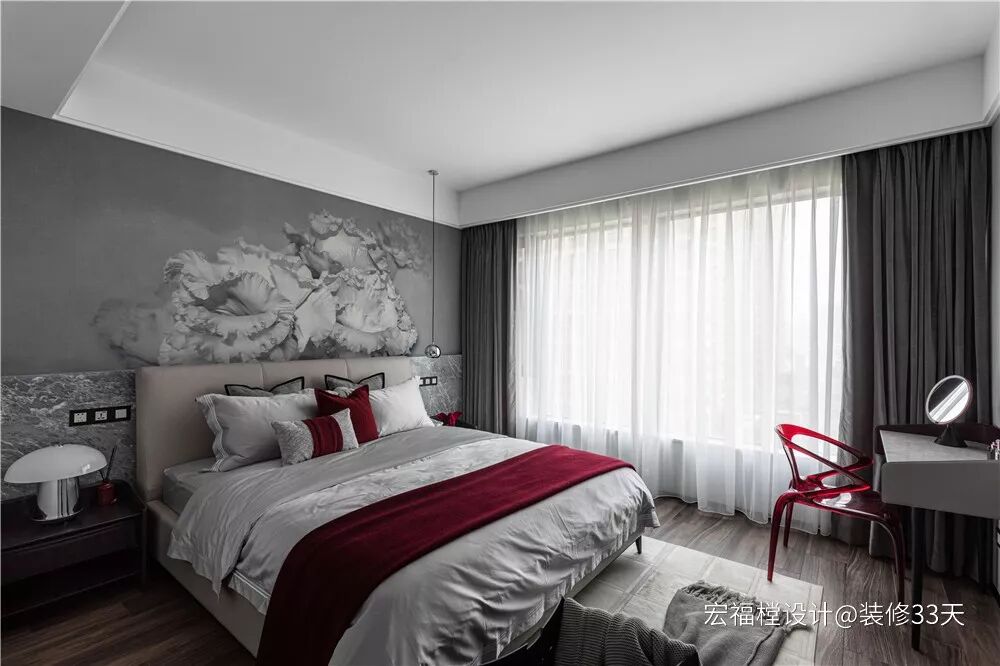 ▲ 主卧,延续灰色调,加入一抹红色点缀,优雅而时尚,床尾设置梳妆区