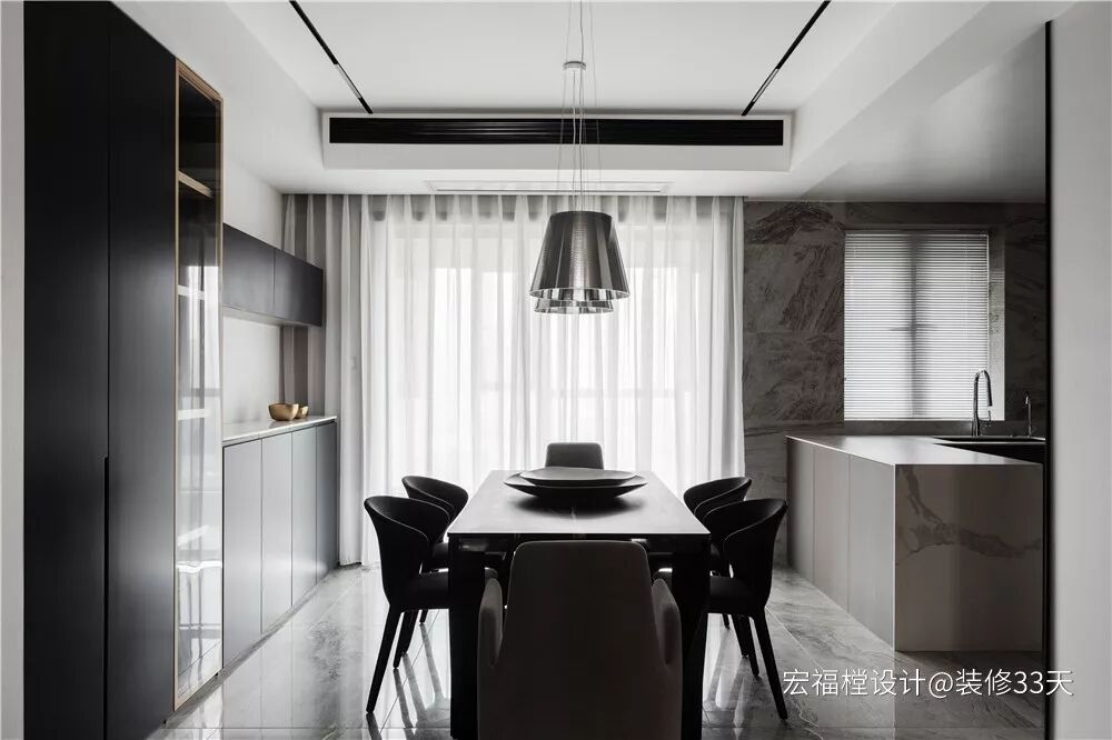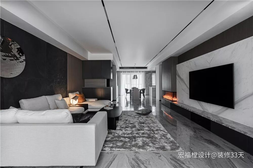 ▲ 客厅望向餐厅视角,一体式吊顶延伸视觉,壁炉为黑白灰空间增添暖意