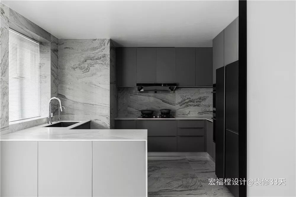 ▲ 开放式厨房,白与灰的配色干净利落,定制大面积橱柜与操作台,满足更多功能