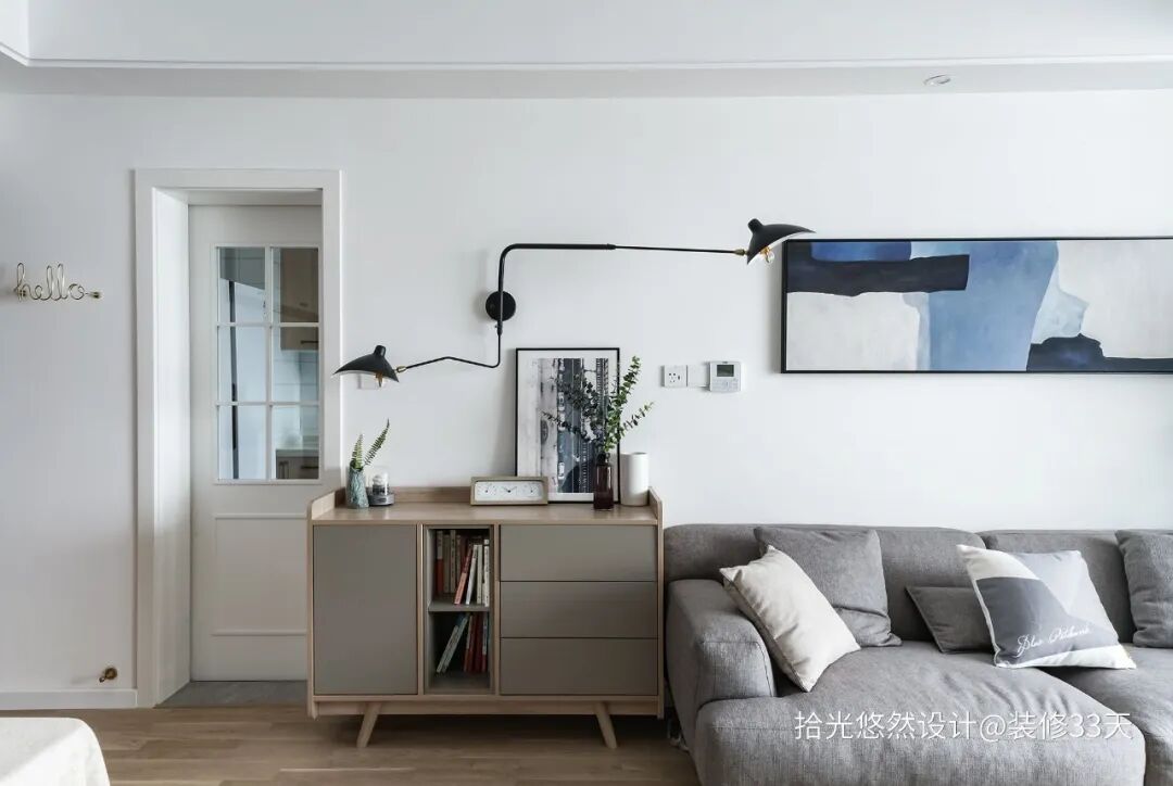 ▲ 沙发边上设置成品装饰柜,补充收纳功能,黑色折叠摇臂灯满足沙发看书照明,同时也是很好的装饰