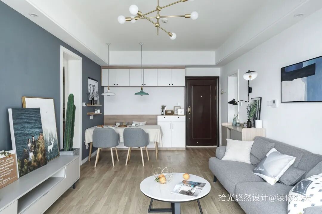 ▲ 客厅整体以雾霾蓝与白色为主,搭配木地板与绿植点缀,给人舒适温馨的感觉