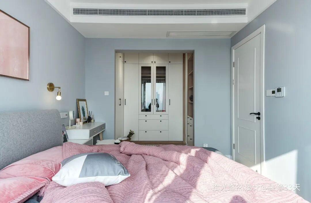 ▲ 主卧以灰蓝色与粉色为主,整个空间看似简单,却在各种不经意的细节里打造了一种舒适的慵懒