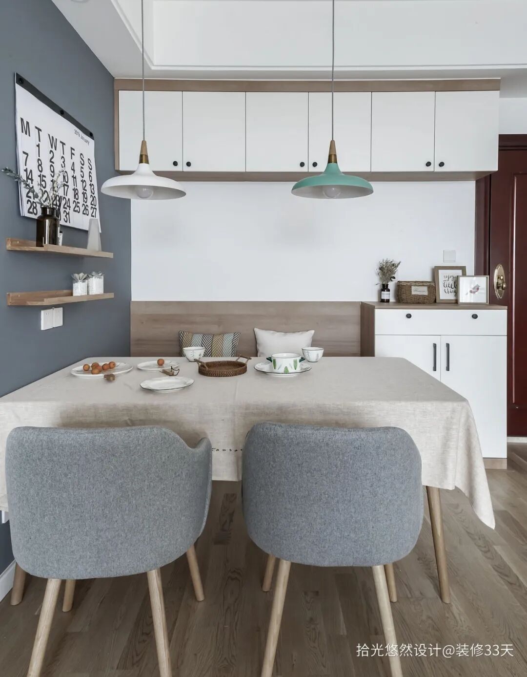 ▲ 餐厅设计为储物卡座+吊柜的模式,兼具鞋柜功能,雾霾蓝背景墙设计隔板做置物装饰