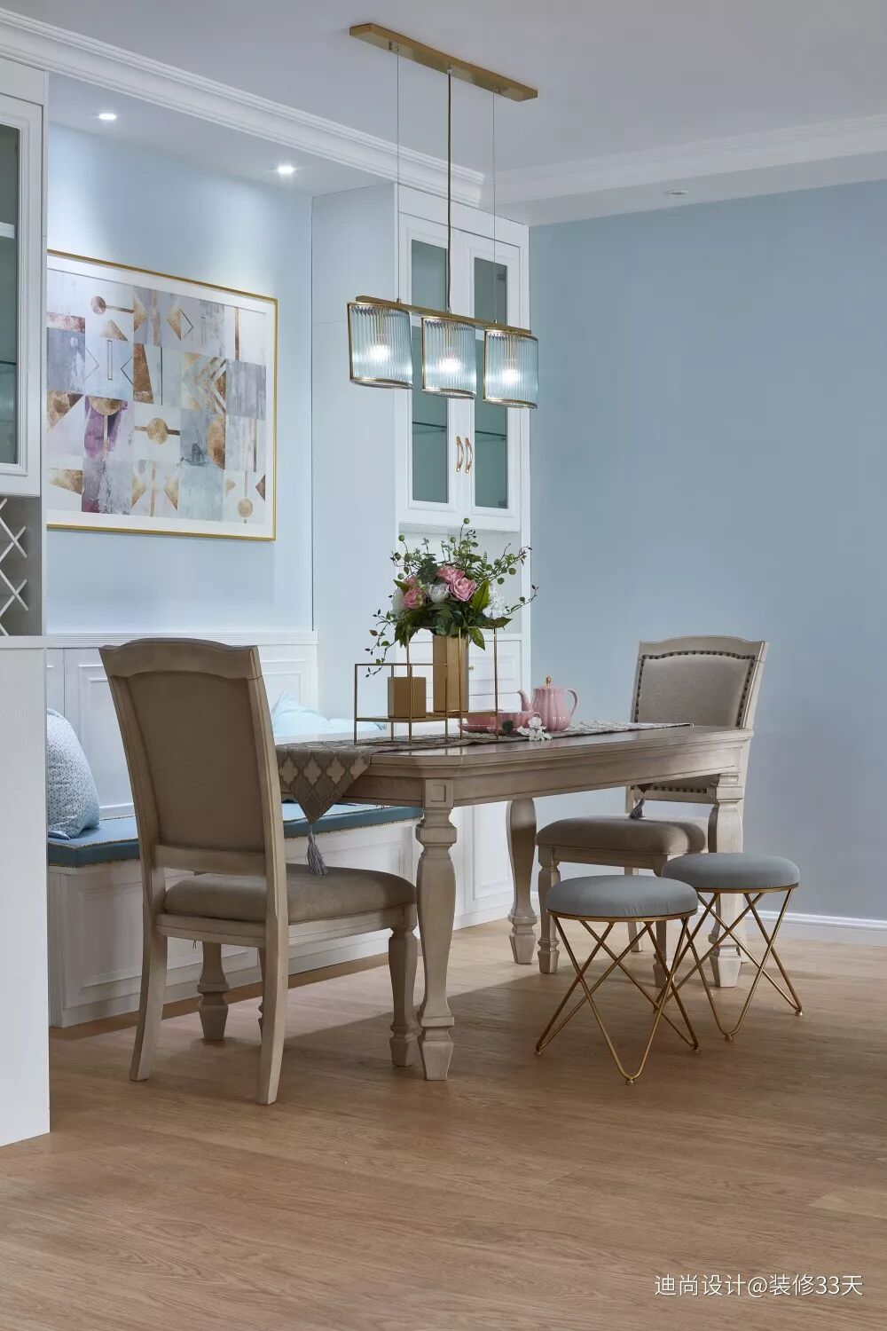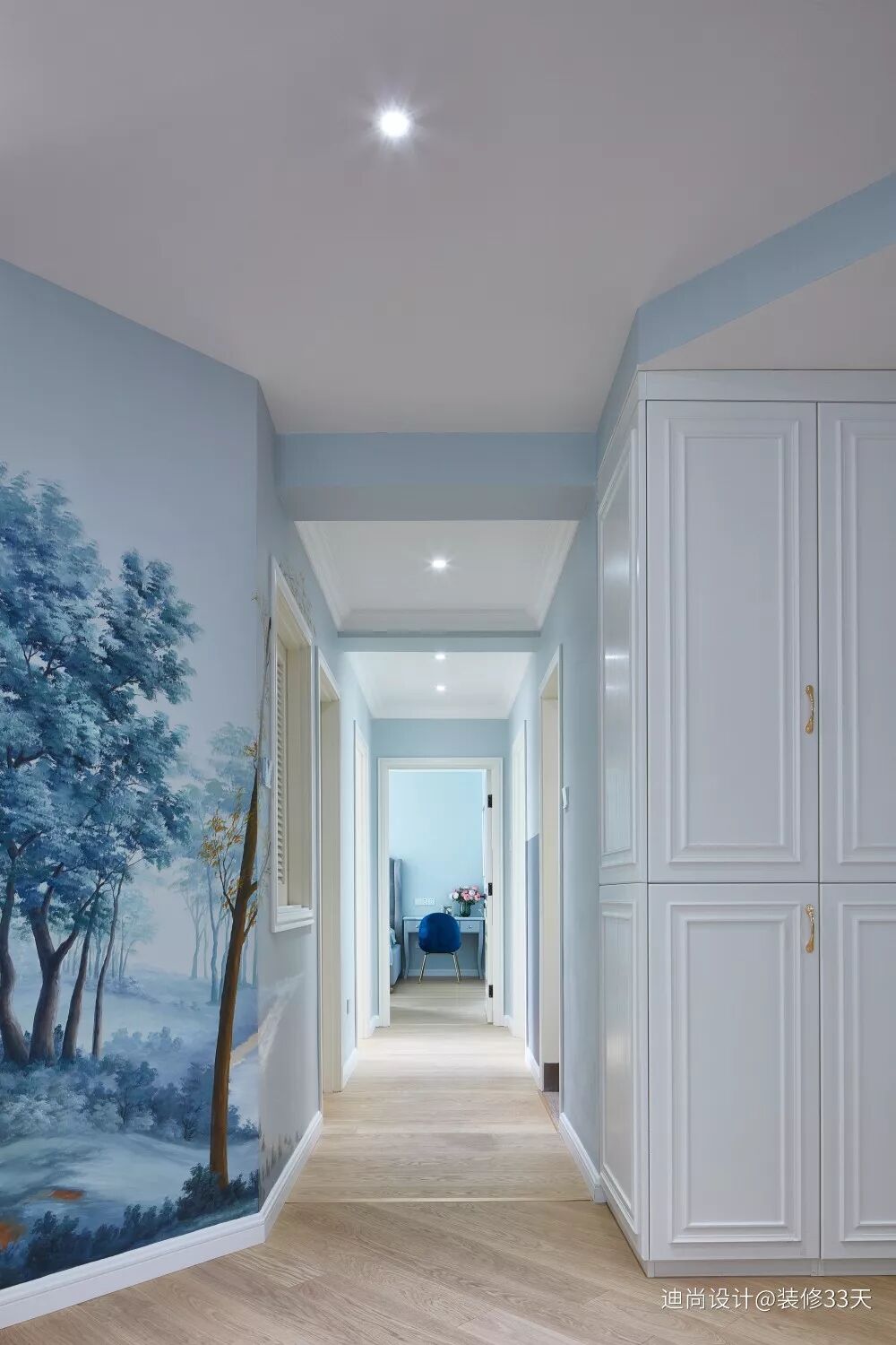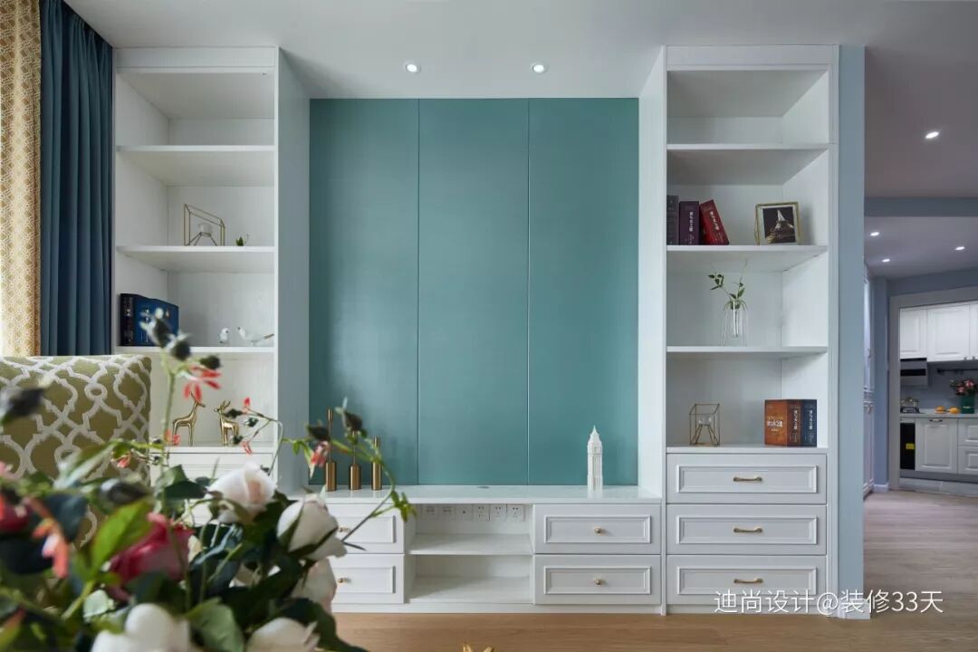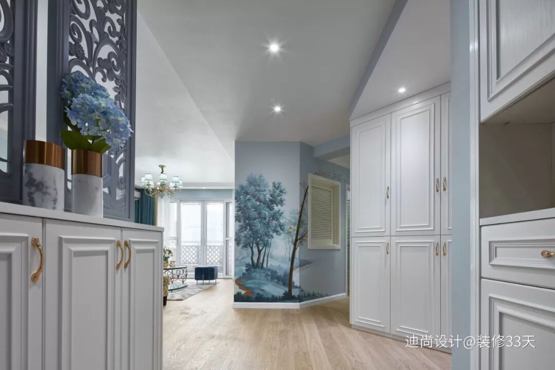 ▲ 入户第一眼首先是电视背景墙后增加三角型杂物房的手绘墙面,以 Tiffany 蓝为底色的曲径小道,散发出一种静谧幽美的气息