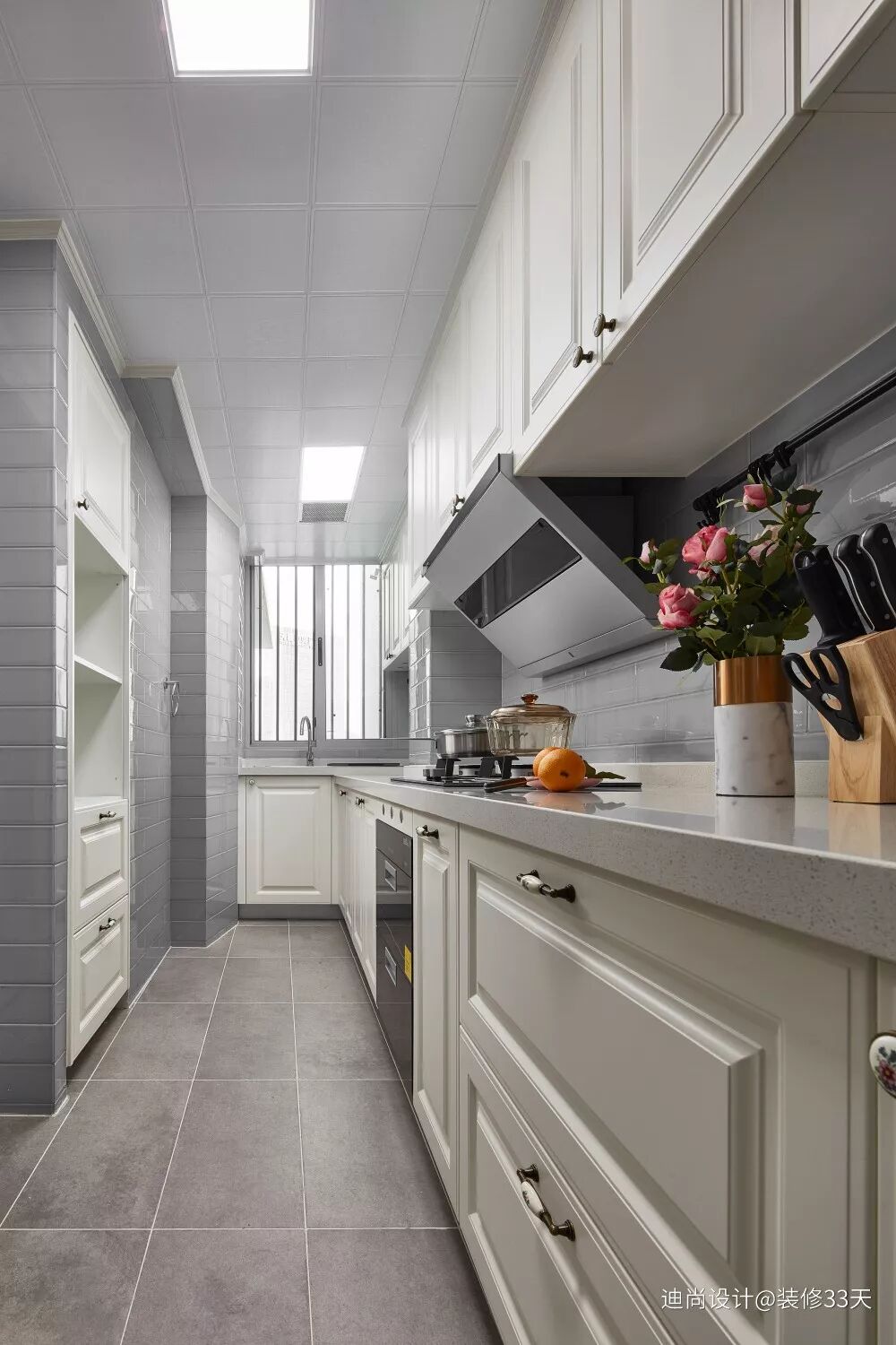 ▲ 设计师利用墙体的厚度,为厨房增设一个储物柜,在保证空间均衡与视觉效果的情况下把收纳发挥至最大,同时增加一字型厨房的便利性