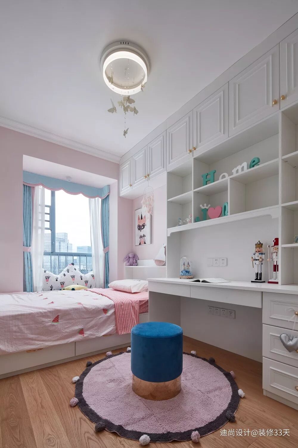 ▲ 儿童房为蓝白基调的整室中增添一抹甜甜的浅粉色,考虑到小孩到2岁才入住,因此儿童房兼顾着书房的功能