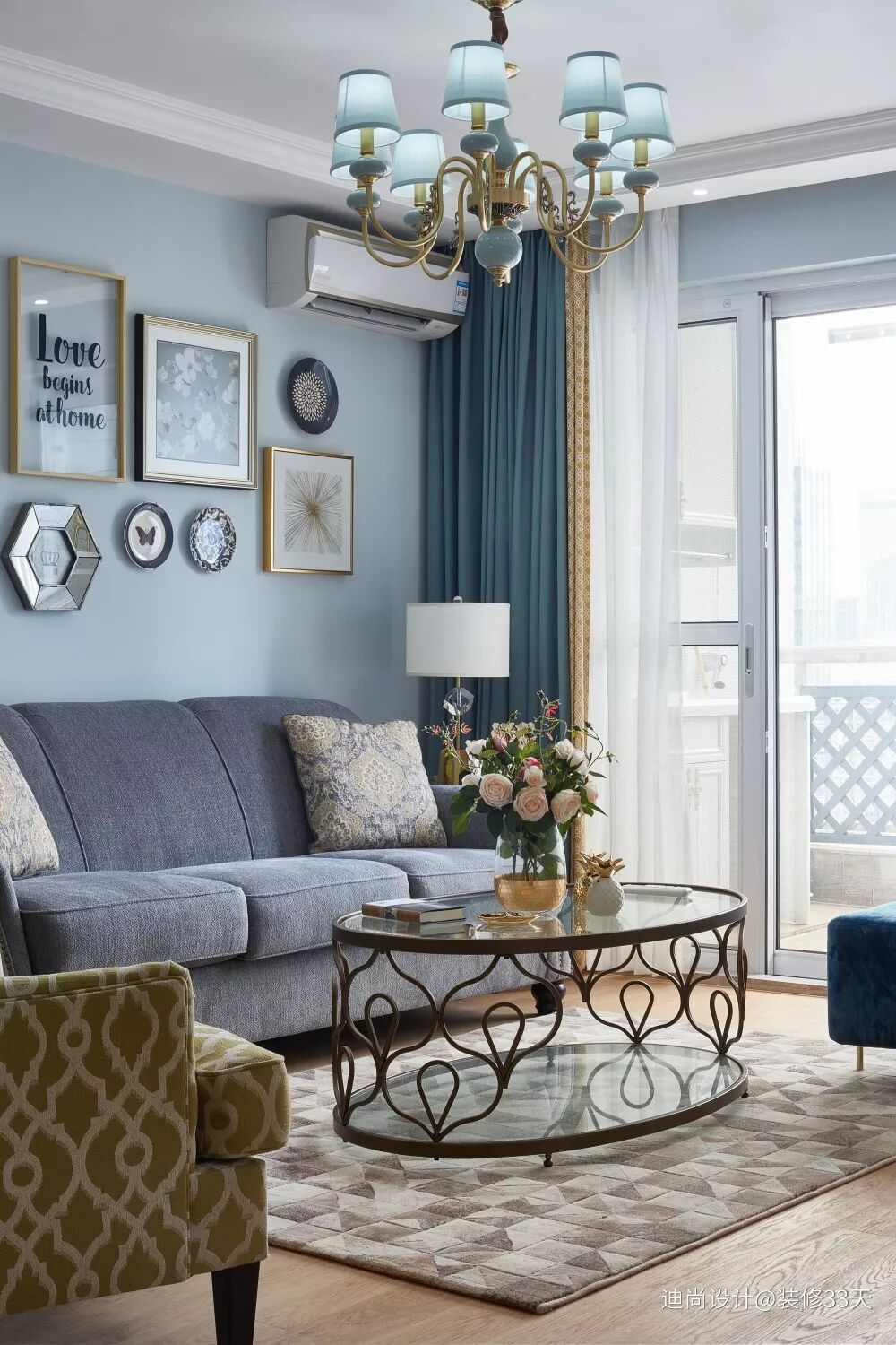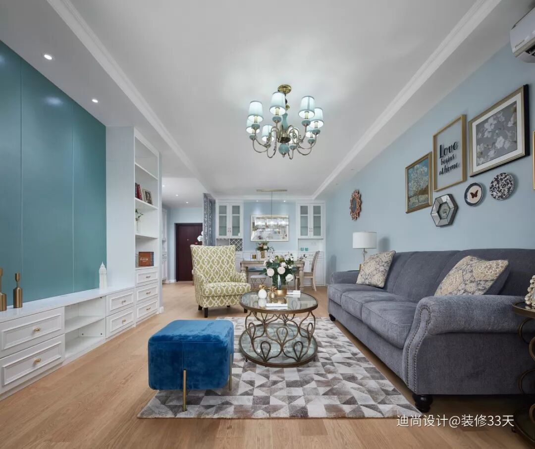 ▲ 客厅,色彩选择上以 Tiffany 蓝和白色为基调,配以金属元素饰品,整体色调和谐统一,绽放出浪漫轻奢的格调