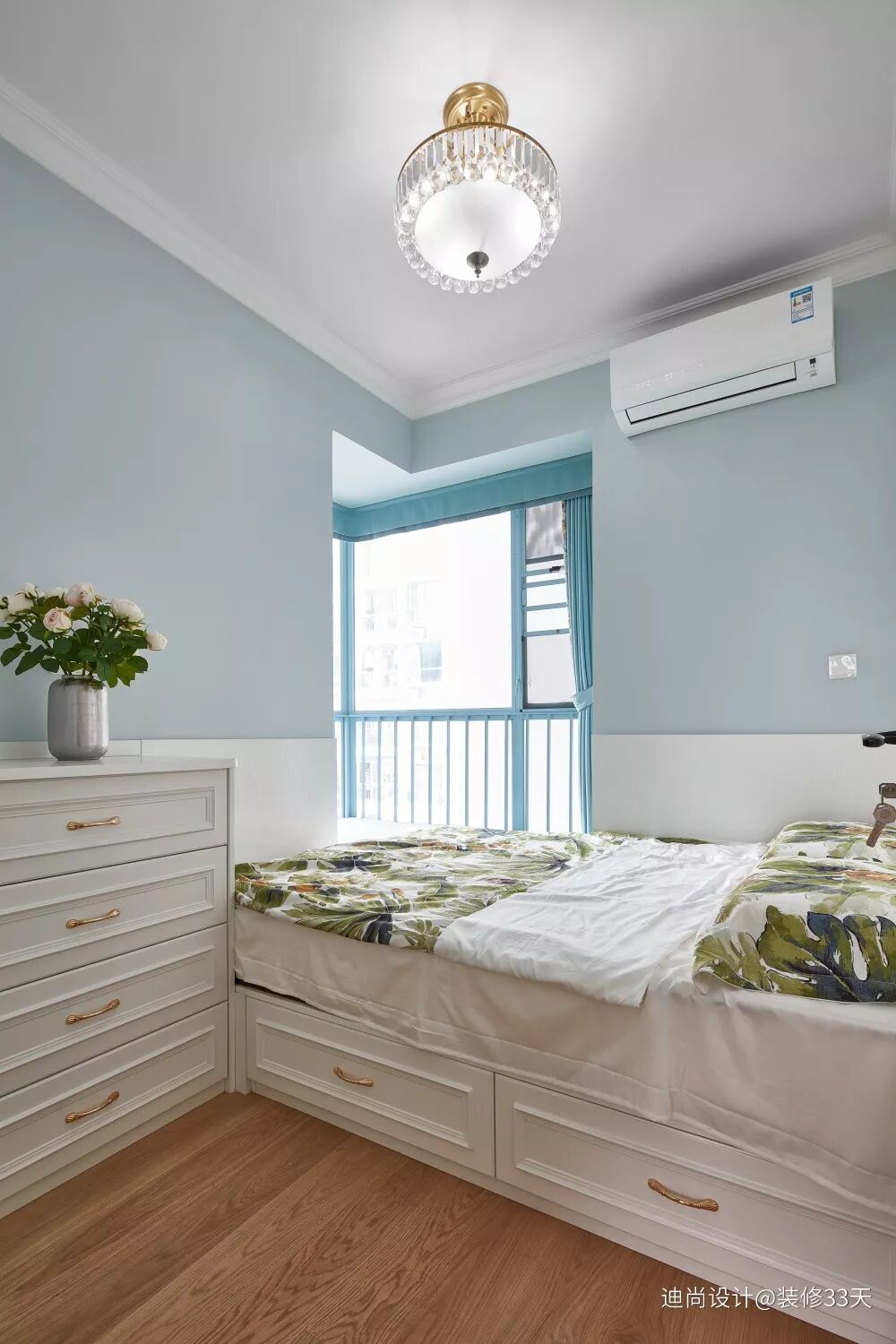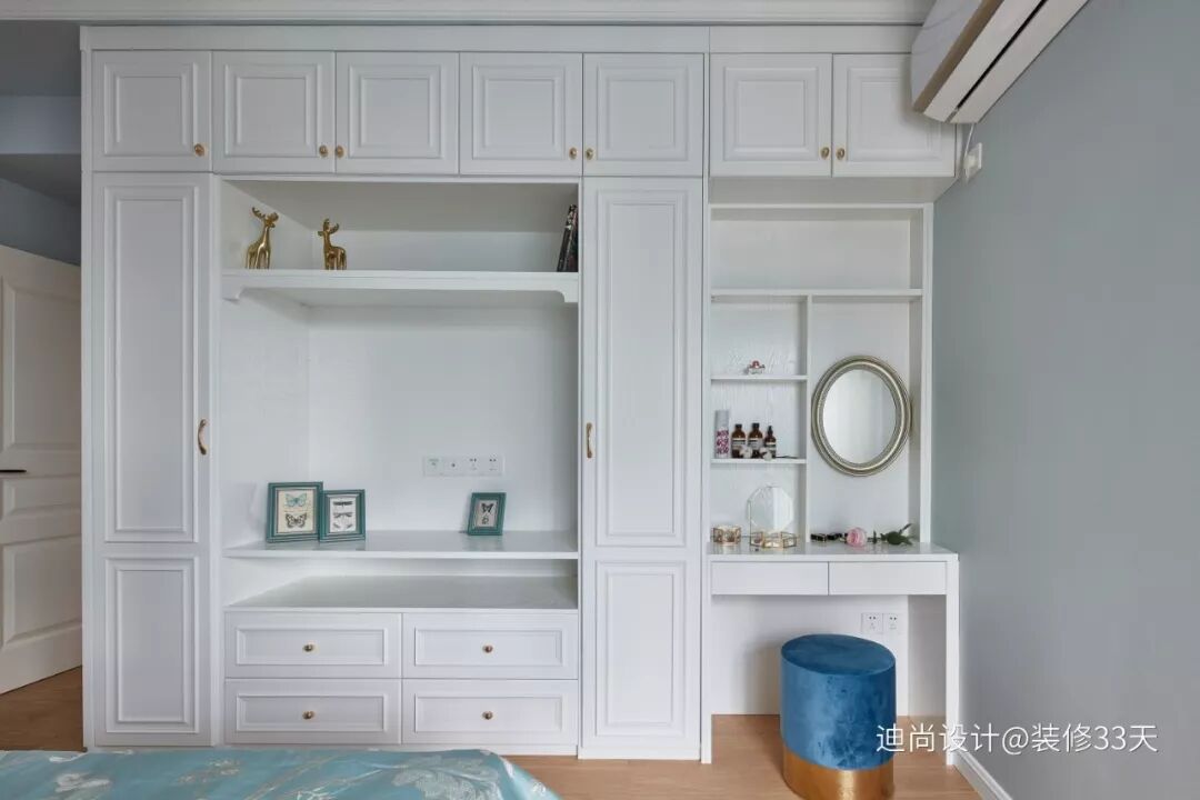 ▲ 主卧是色系的延伸,保持空间的连贯性,静谧的蓝色背景墙,洁白的实木柜体,灰色的布艺宫廷床,为主卧提供舒适安静的休憩空间