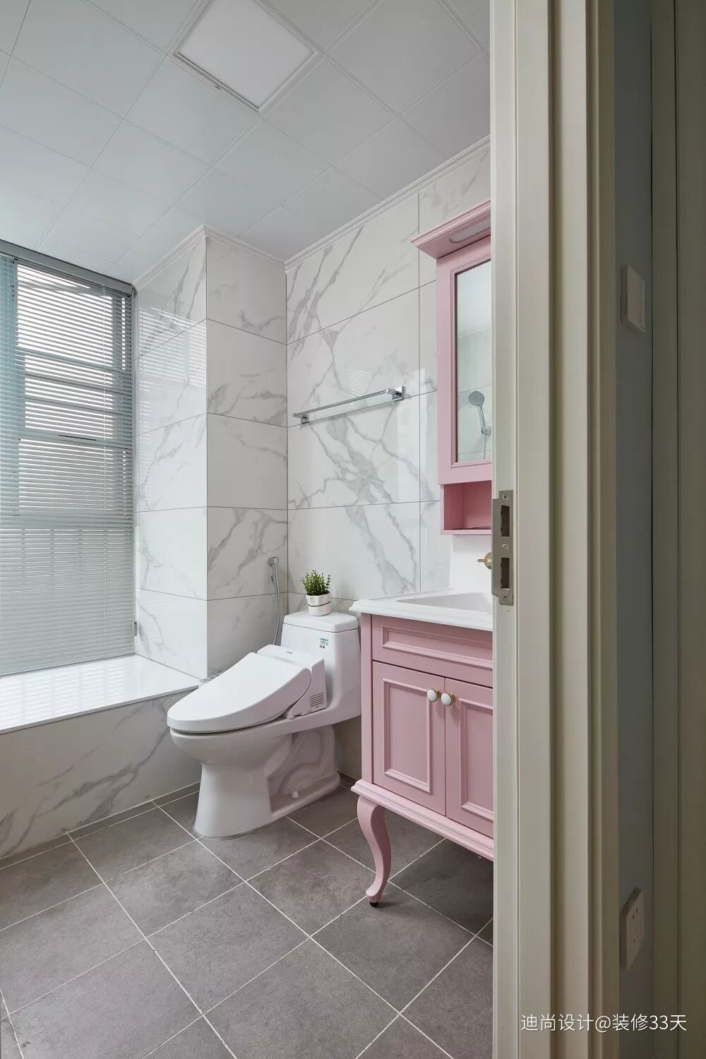 ▲ 大理石纹与粉色柜体的结合,一柔一刚,表述的情感忽然变得丰富起来,刚毅中透露着柔韧,坚挺中又有了袅娜