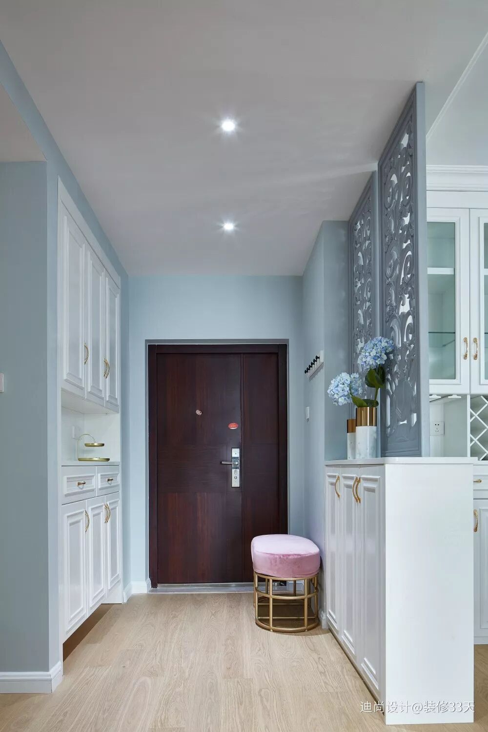 ▲ 餐厅与过道一侧设计的半高鞋柜,上方搭配雕花镂空隔断,在形成餐厅空间同时也起到装饰点缀效果