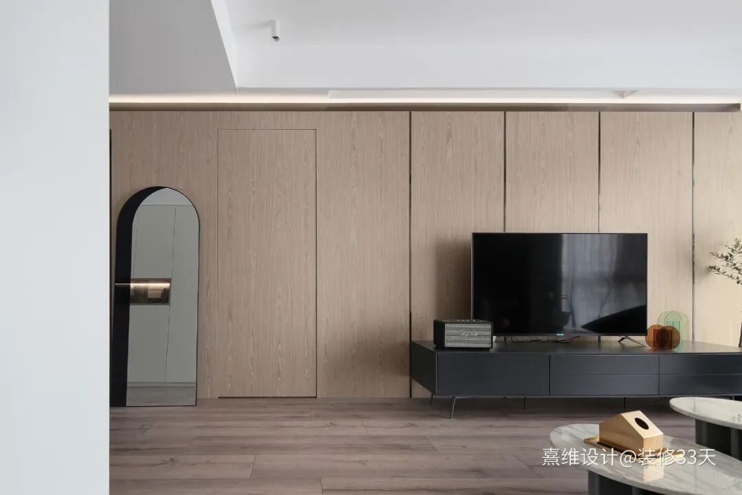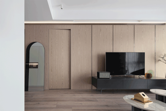 ▲ 连绵的木饰面,自然的木纹低调柔和又分明可见,重色压条分割出块面,而次卧的房门选择隐形门融于木色之中