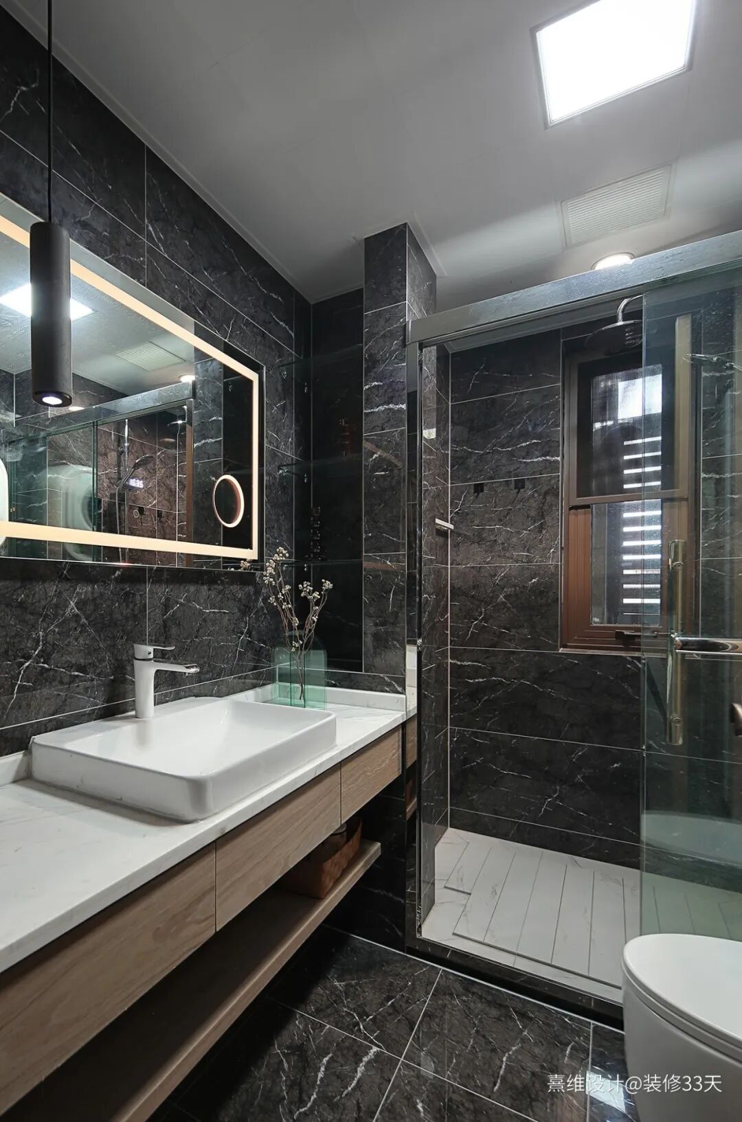 ▲ 卫生间,整体铺贴深色石纹瓷砖,造型简洁,颜色清淡的浴室柜与壁龛涵盖卫生间所需要的收纳空间
