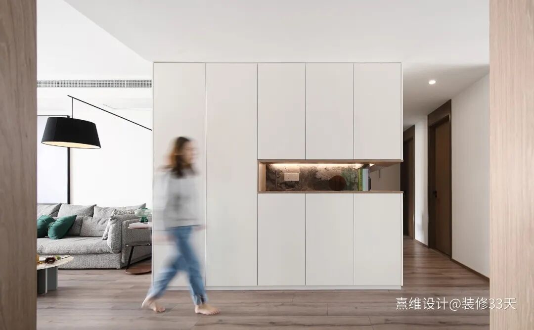 ▲ 入户,选择用两层柜体代替墙壁,朝向衣帽间的柜体作为衣柜,面对入户门的则作为玄关柜,柜体右边中部的镂空处理,原木色包边,嵌入大理石背板+隐形光源,为玄关增添明亮的光感,让生活有序