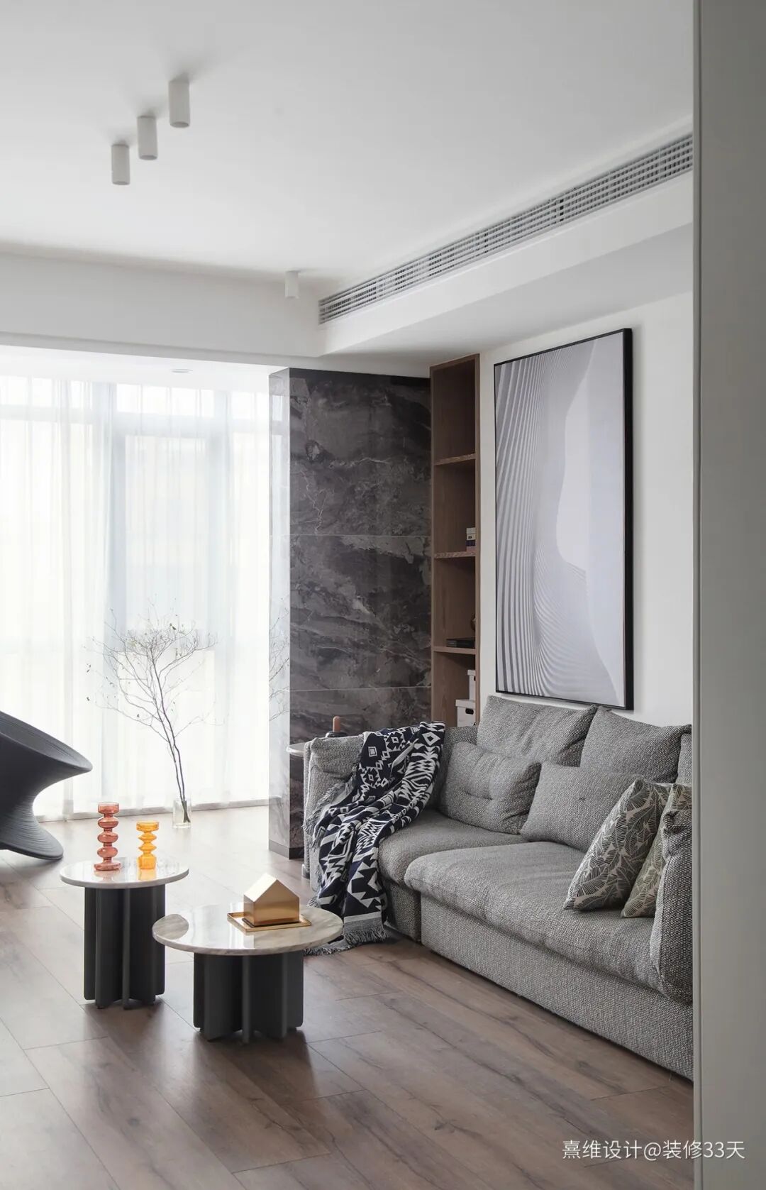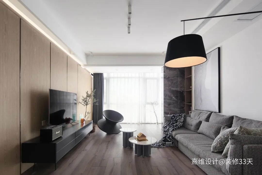 ▲ 客厅,简练的白墙与温润的木饰面为底,辅以冷灰花色大理石来点缀,简约中是柔和悠远的意蕴