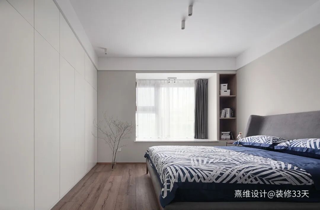▲ 主卧收纳挖掘到淋漓尽致,墙体朝客厅方向推移,让卧室拥有整面素白的衣柜,飘窗边的开放式收纳靠近床头,陪伴睡前时光的书本可以置于此处