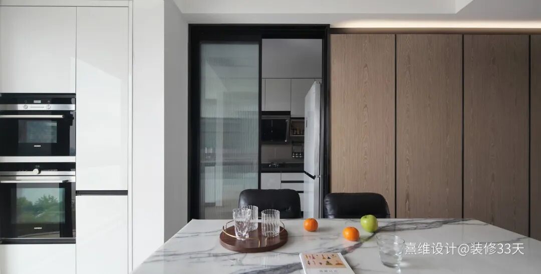 ▲ 餐桌另一边打造餐边柜,预留大型厨电位置,解放厨房空间,新砌的单墙将冰箱藏在墙角,餐厅与客厅材质上的呼应让整体观感更加贴合,和而不同