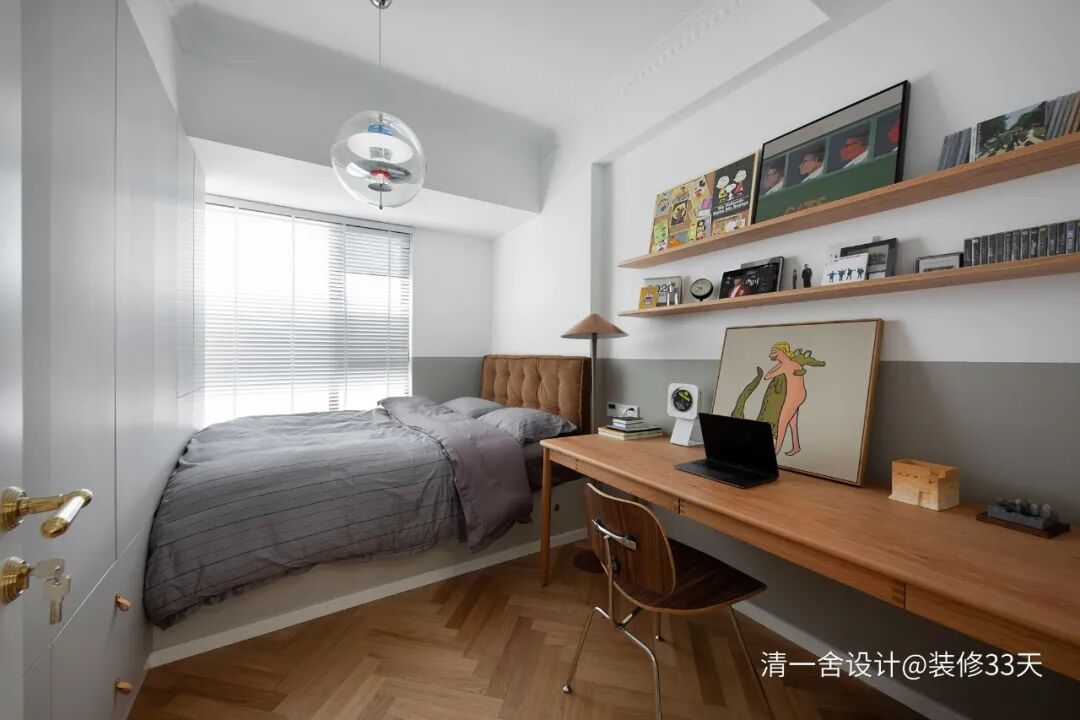 ▲ 儿子房,分色墙体搭配人字铺木地板,榻榻米床铺靠窗留出充裕的设计空间,床尾打造整面墙收纳柜,一张大书桌上方安装原木双层隔板,放置小时候的玩意儿