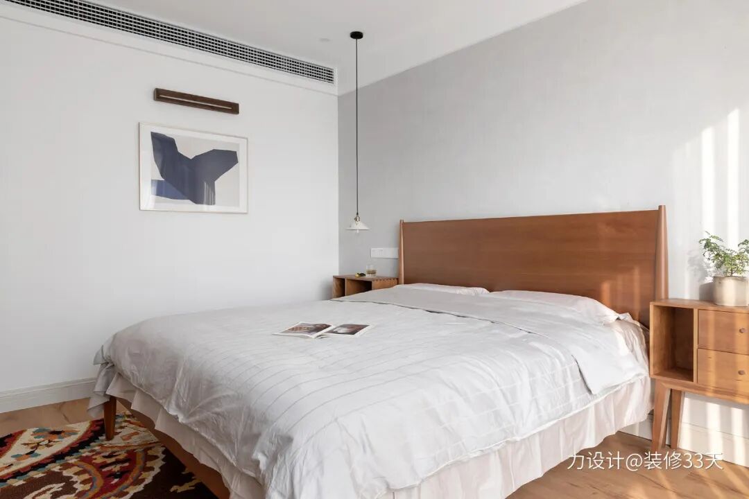 ▲ 白色和原木色从客厅伸至主卧,整体统一融合,效果温馨舒适,取消床边柜,采用步入式衣帽间满足储物需求