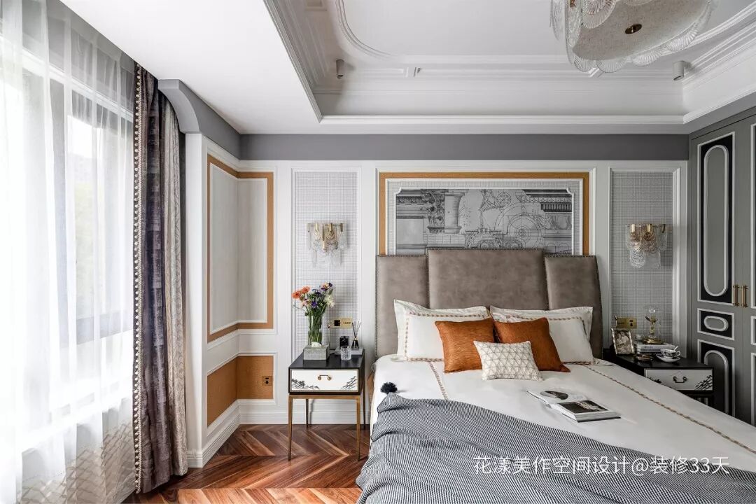 ▲ 主卧,以浅灰奶白为主色调,局部点缀橙色,褐色,深灰,地面均选用深胡桃木实木鱼骨地板,整体给人优雅尊贵的视觉体验