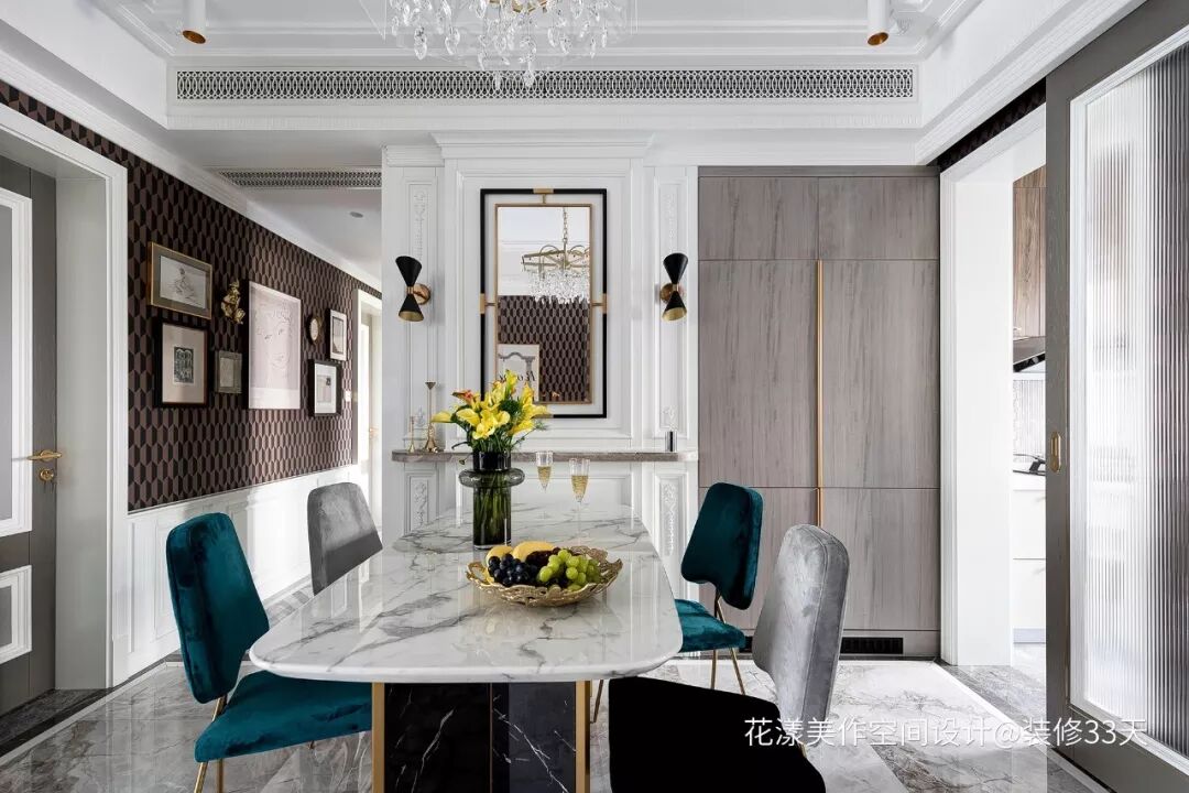 ▲ 餐厅是整屋的中厅,在主背景上运用帽头,上下护墙分割,雕花,对称黑金壁灯,金色框装饰镜,将多元素揉搓融合,结合水晶吊灯,石膏美式线条等一系列经典美式元素,框出餐厅唯美动人的轻奢风采