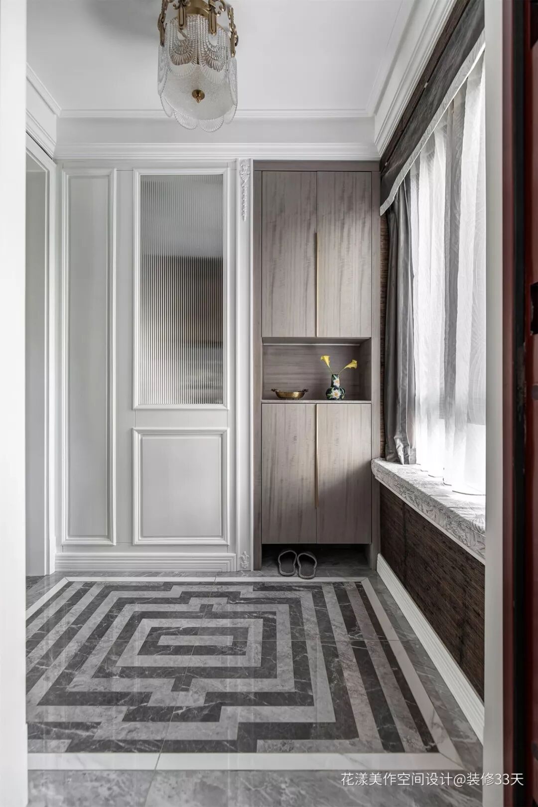 ▲ 入户门厅地面立体回纹图形,入墙鞋柜,中层开放展架,底部架空,飘窗台面定制软垫,当换鞋凳使用