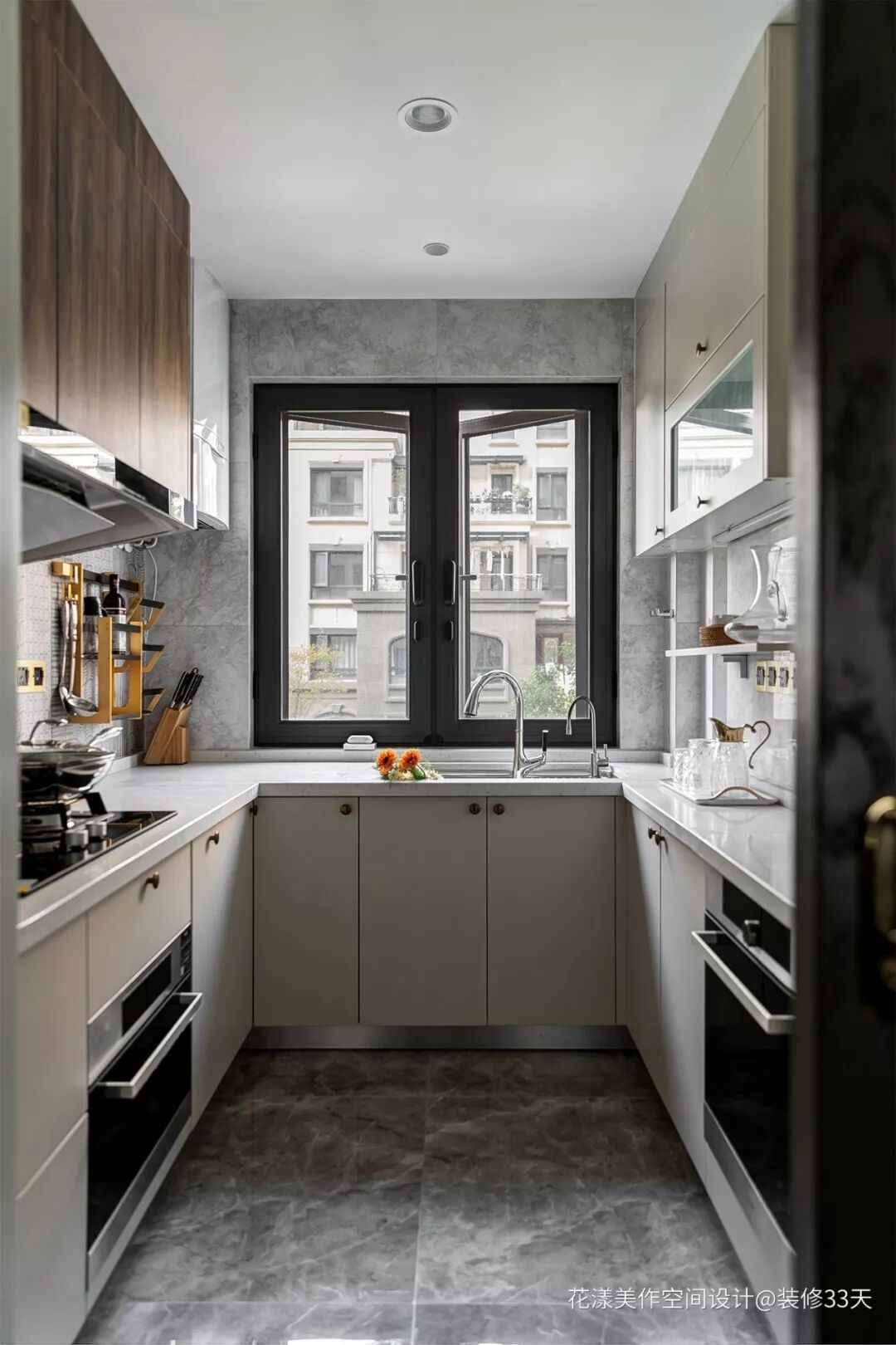 ▲ 厨房,吊柜深胡桃木平板门的颜色与整屋的鱼骨地板类似,配亚克力把手,下柜是奶白色烤漆门板,金色把手点缀,灶台的背景砖选四色混拼花纹长条砖,所有软装的选择都透露着精致的小心思
