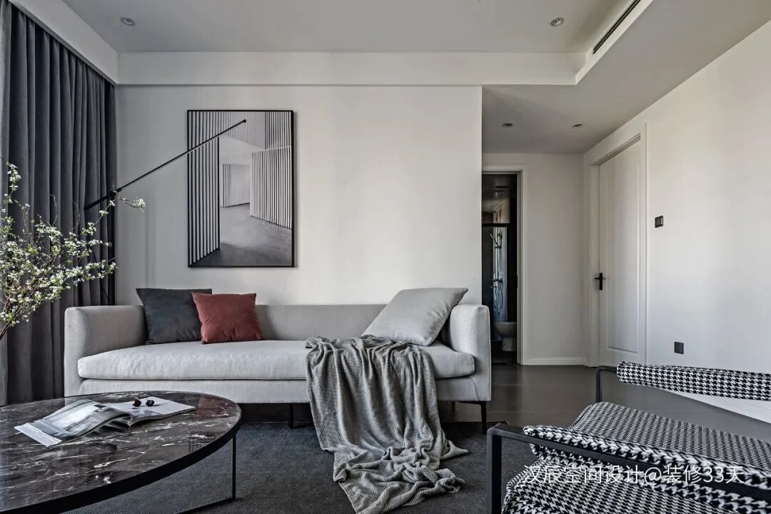 ▲ 客厅,灰色的布艺沙发搭配圆形大理石茶几,背景墙点缀建筑装饰画,与落地灯的线性造型相呼应