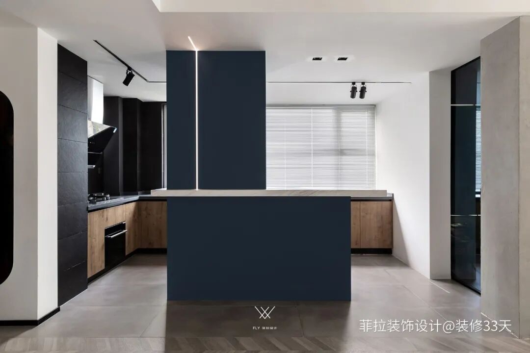 ▲ 开放式厨房,设计L型体块隐藏冰箱,穿插白色大理石台面增加出吧台功能,线性灯带延伸至顶面,减少L型体块的厚重感