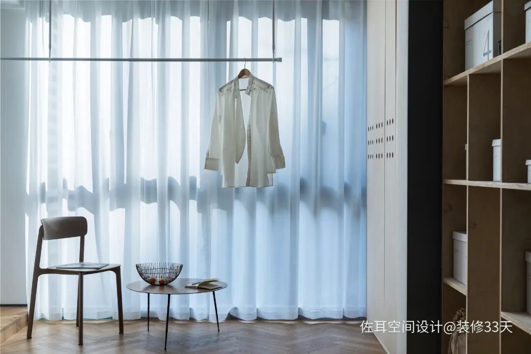 ▲ 阳台场域不仅是休闲一角,设计挂衣杆,平时可以晾晒一些烘干的衣物,不晾晒的时候作开放式衣橱