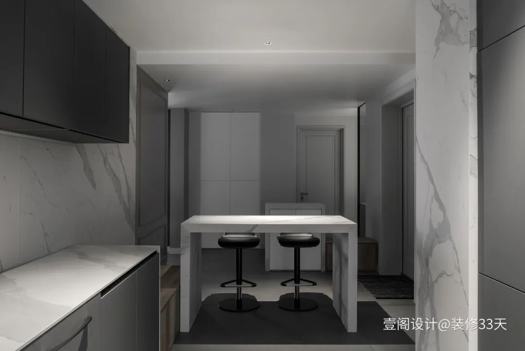▲ 玄关左手边为开放式厨房,定制吧台划分空间,吧台带来体验上的多样性,既可以在烹饪时当台面使用,又可以当作早餐台