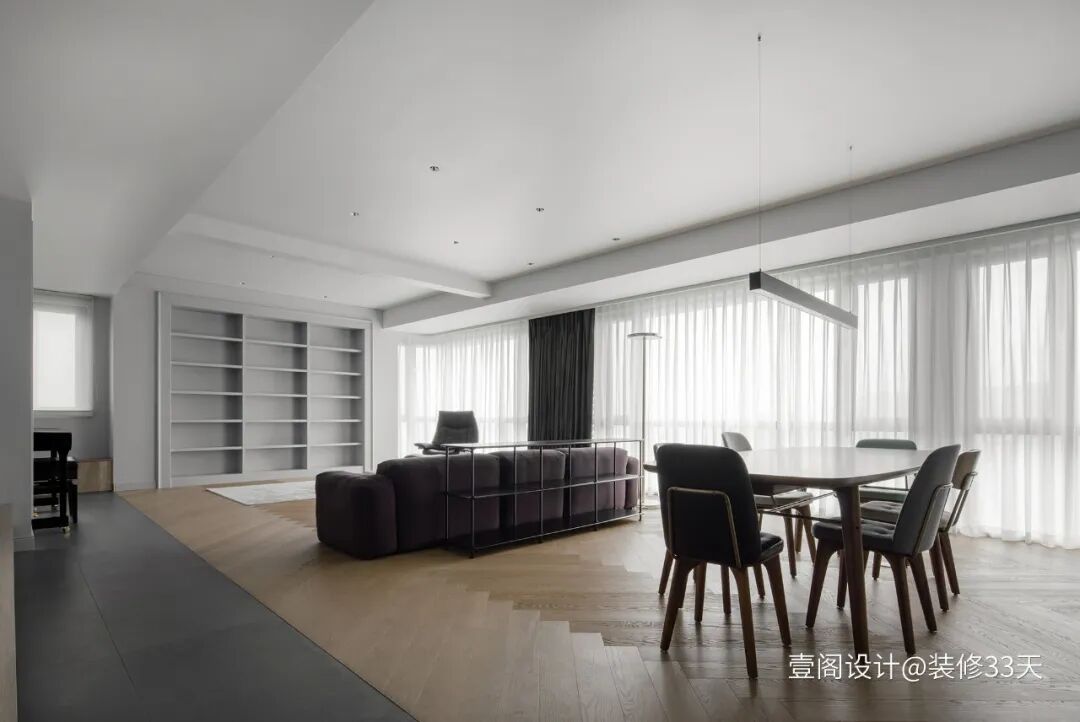 ▲ 打开客厅的阳台、储藏室,让客餐厅更为宽敞大气,大面积的落地窗带来充足的光线,地面选用灰色地砖拼接木地板,细致的收口细节展现高级品质感