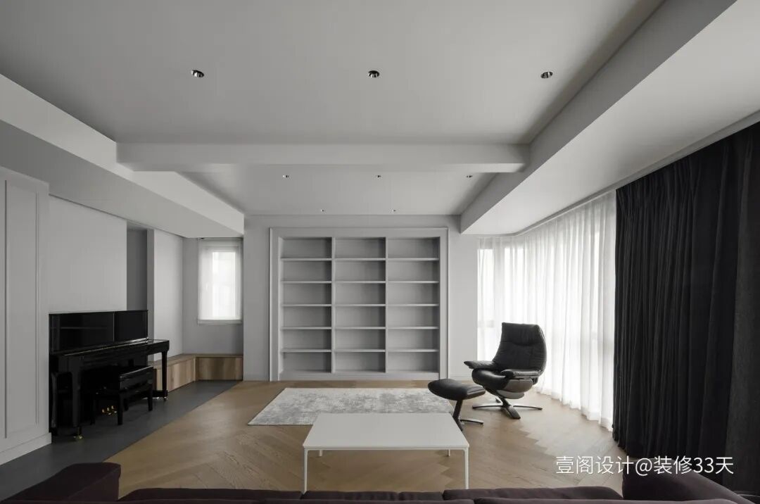 ▲ 客厅空间采用围合式布局,开放式书架成为视觉焦点,钢琴、电视机围绕两侧,留出了足够空间给家人活动