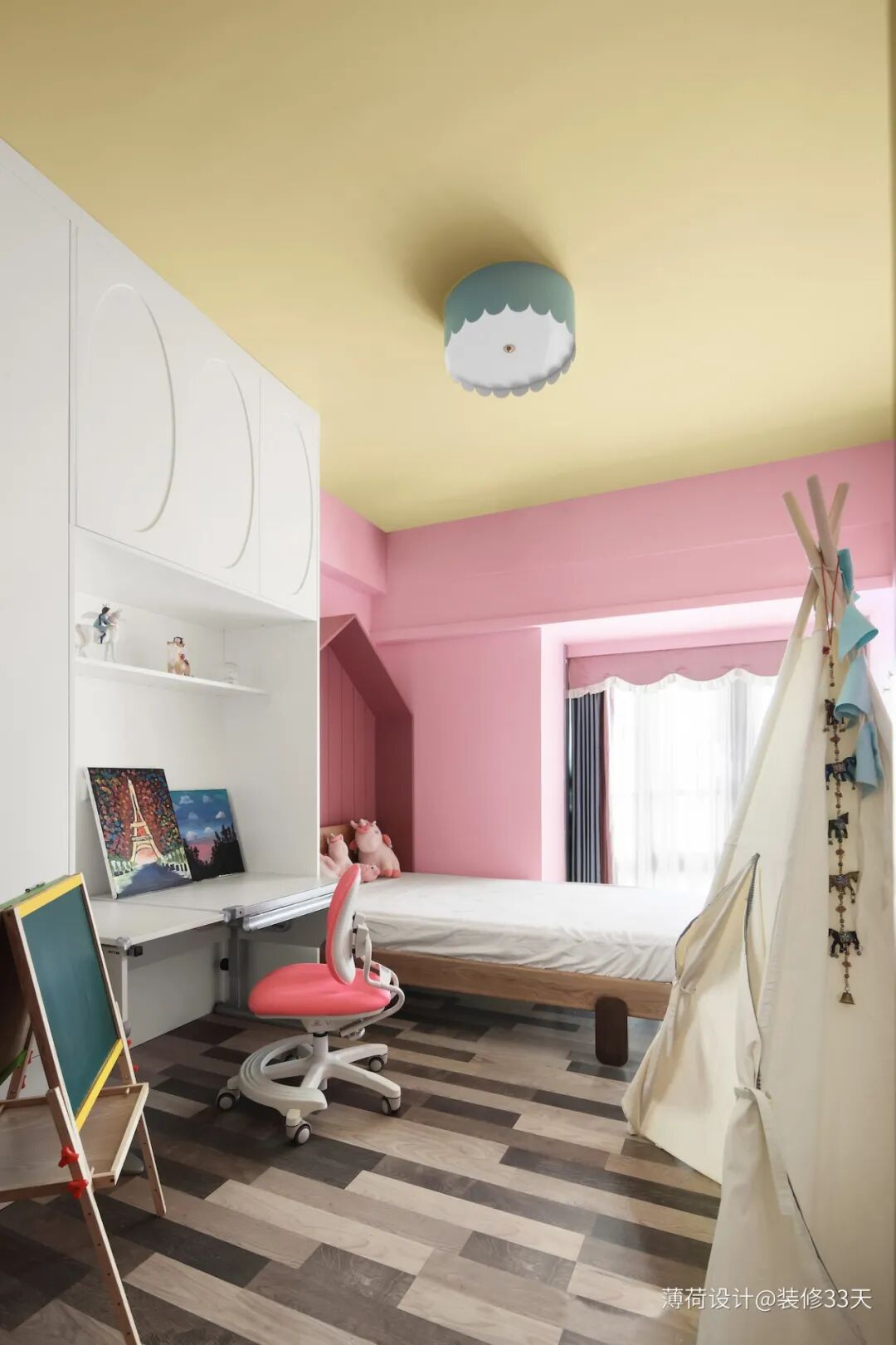 ▲ 儿童房用色活泼,黄色的顶面,粉色的墙,小女孩喜欢的调调