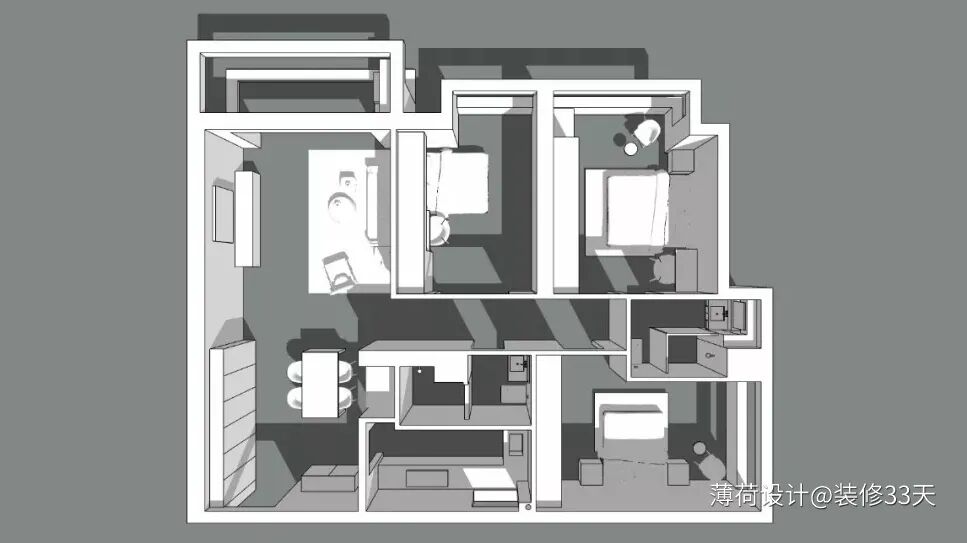 3、仅保留客厅与过道的两堵墙,将空间重新规划定义。